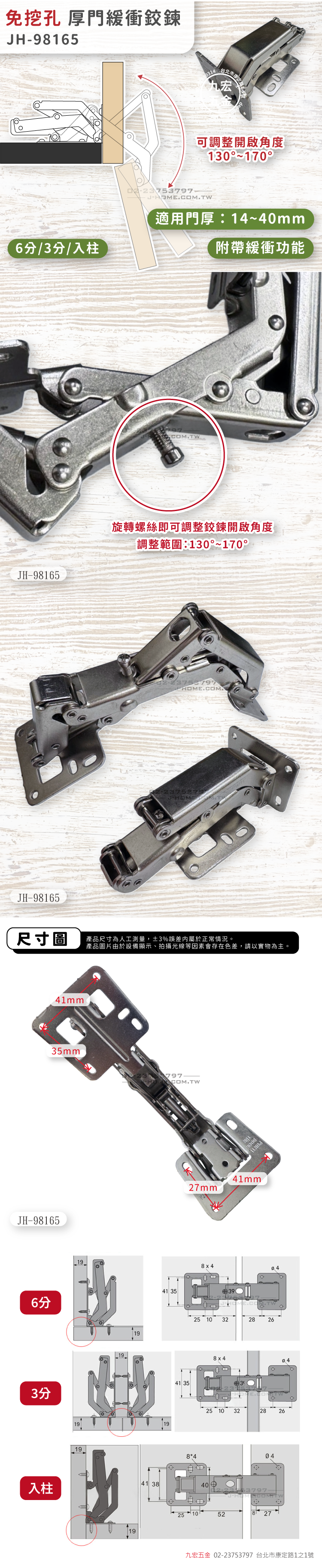 產品介紹 專為厚門板設計的免挖孔鉸鍊,安裝簡單,不需挖孔即可牢固固定。 具備緩衝功能,開關櫃門更安靜順暢,避免碰撞與噪音。 可透過旋轉螺絲調整開啟角度,範圍 130°~170°。 結構堅固,承重佳,特別適合厚實櫃門與高質感家具。